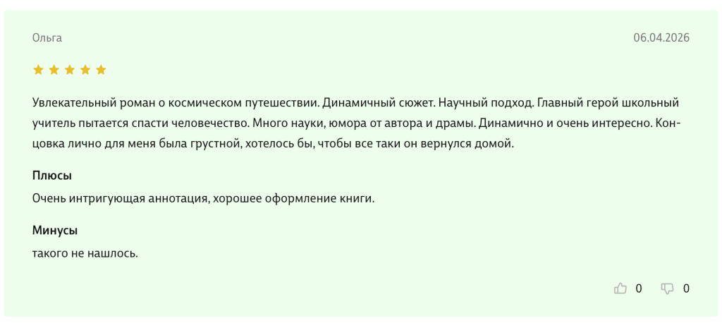 После “Марсианина” от него уже ждали именно такого: научпоп, завернутый в сюжет, где каждая формула и каждый эксперимент не для красоты, а потому что иначе герой не выживет. “Артемида” у многих читателей прошла слабее, и складывается ощущение, что “Проект” для Вейера стал возвращением в свою самую сильную зону: одиночество, выживание, наука, и постоянное “у меня нет права на ошибку”.