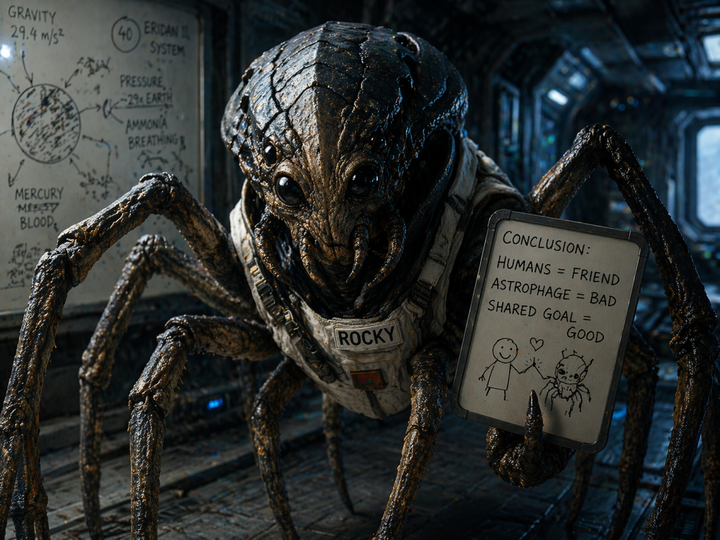Так в книге появляется Рокки, пришелец из системы 40 Эридана. Их планета тоже под ударом астрофага, и они пришли к тому же решению, что и земляне: надо лететь туда, где звезда не тухнет. Вейер делает этот контакт очень “научным”: не магия, не телепатия, а попытка понять друг друга с нуля, через физику, биологию и инженерку. И это один из самых крутых элементов романа, потому что ты реально веришь в такую дружбу. Она не “потому что так надо сюжету”, а потому что иначе они оба не выживут.